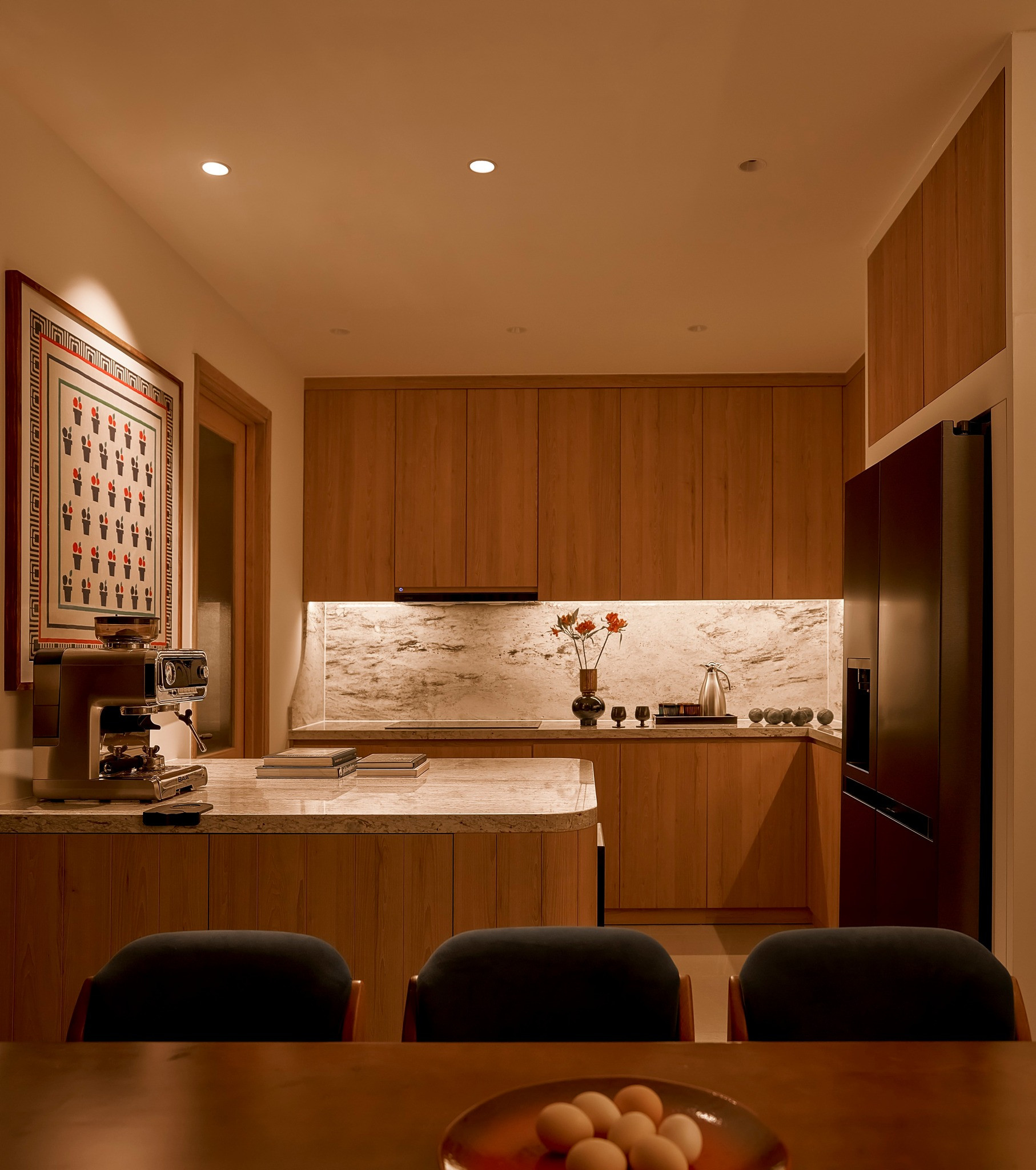 Tầng 1 được bố trí làm khu vực sinh hoạt chung gồm phòng khách, bếp. Nội thất chủ đạo là đồ gỗ kết hợp cùng ánh sáng vàng dịu, tạo cảm giác ấm cúng, thư giãn.