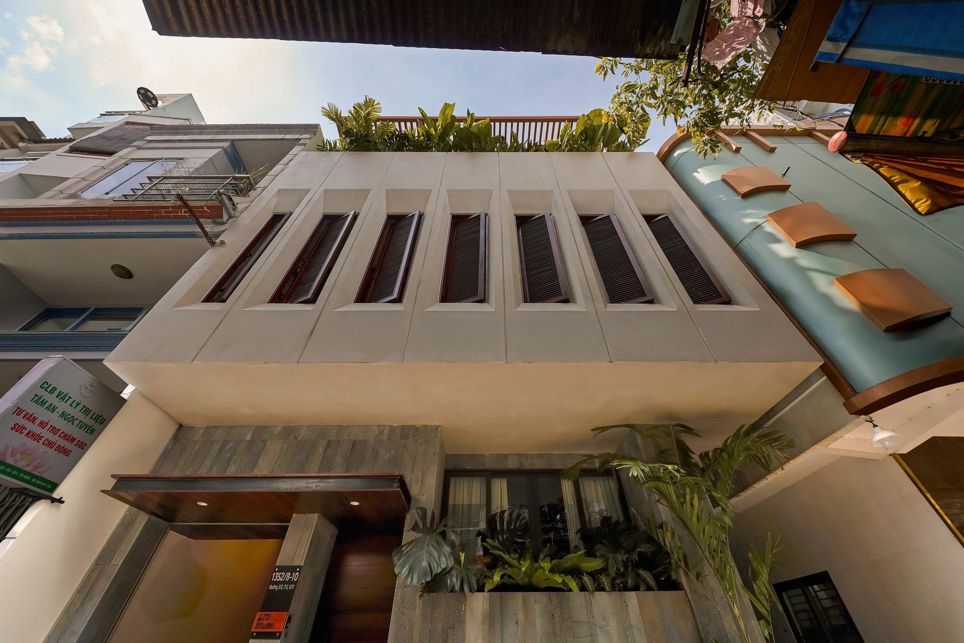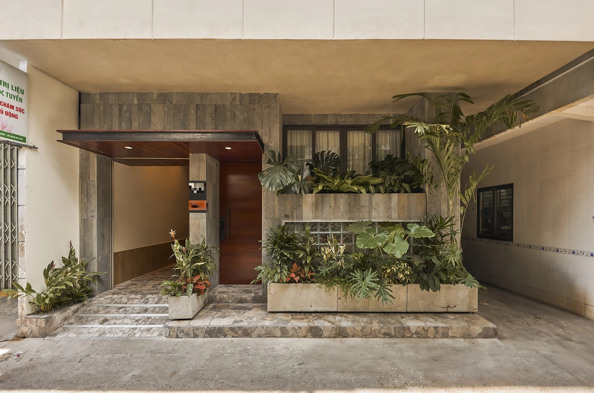 Lối vào nhà được thiết kế như một khu vườn nhiệt đới 2 tầng. Mặt tiền được thiết kế cửa gió louver, kết hợp vườn cây nhằm tối ưu ánh sáng tự nhiên và gió trời.