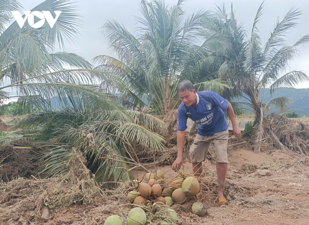 Ông Trần Thanh Vinh thu gom những trái dừa còn sót lại sau vụ vỡ đập gây lũ quét