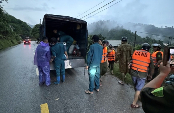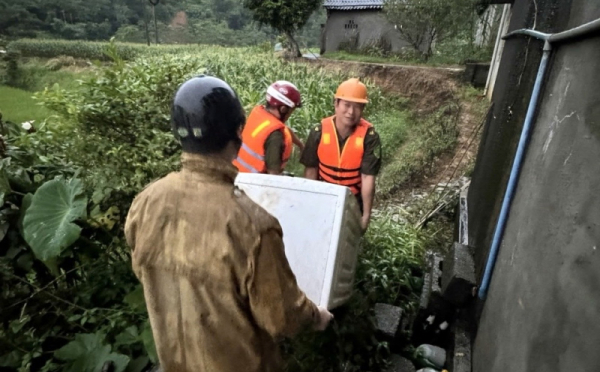 Công an xã Tân Tiến hỗ trợ người dân có nguy cơ bị ảnh hưởng bởi sự cố vỡ đập thủy điện Bắc Khê 1 di chuyển tài sản đến nơi an toàn.
