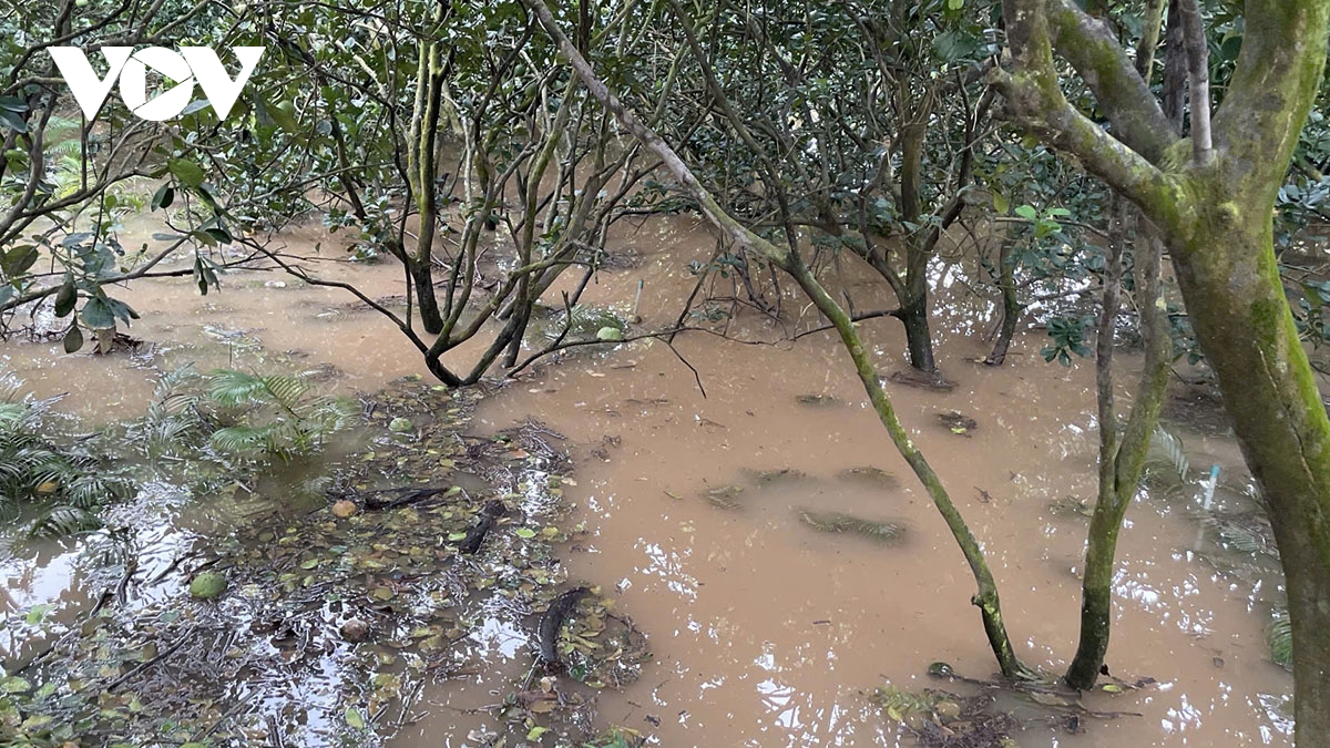 Vườn bưởi của nông dân tại cồn Thanh Long bị ngập nước