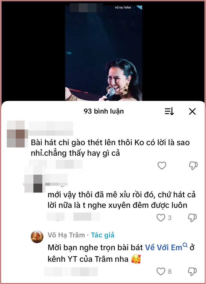 Câu trả lời ngắn gọn nhưng thể hiện sự tự tin tuyệt đối vào sản phẩm âm nhạc của mình, đồng thời cho thấy thái độ tôn trọng khán giả và tinh thần tích cực trong giao tiếp. Không chỉ khéo léo hóa giải ý kiến tiêu cực, cách phản hồi này còn gián tiếp quảng bá cho ca khúc, chứng minh Võ Hạ Trâm không chỉ chinh phục công chúng bằng giọng hát nội lực mà còn bằng phong thái văn minh, tự tin và đầy bản lĩnh của một nghệ sĩ trưởng thành.