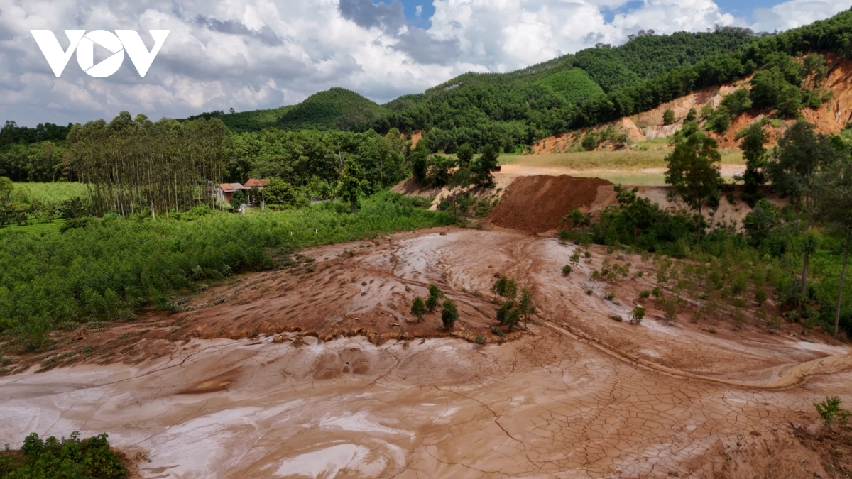 Hồ chứa được đặt trên sườn đồi. Sau sự cố, lượng lớn bùn đặc sệt đã tràn xuống khu vực hạ lưu, phủ kín đất canh tác, ao cá và một số khu vực sinh sống của người dân.