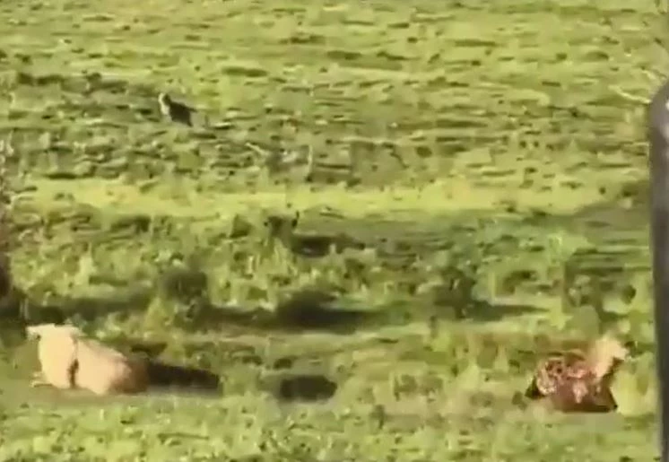 Theo hình ảnh trong video, một con sư tử đực bất ngờ tăng tốc, lao về phía một con linh cẩu đang di chuyển phía trước, tạo ra một cuộc rượt đuổi đầy kịch tính.