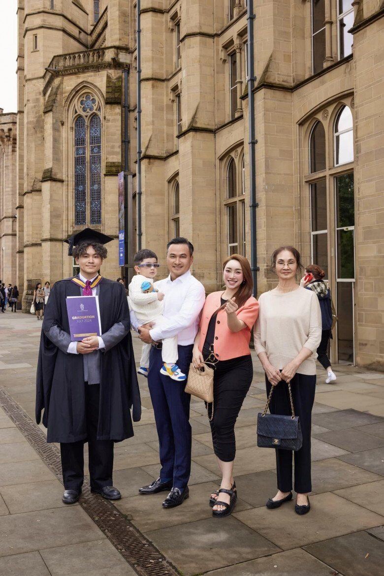 Con trai Chi Bảo tốt nghiệp đại học ở Anh, được cả nhà bay sang chúc mừng.