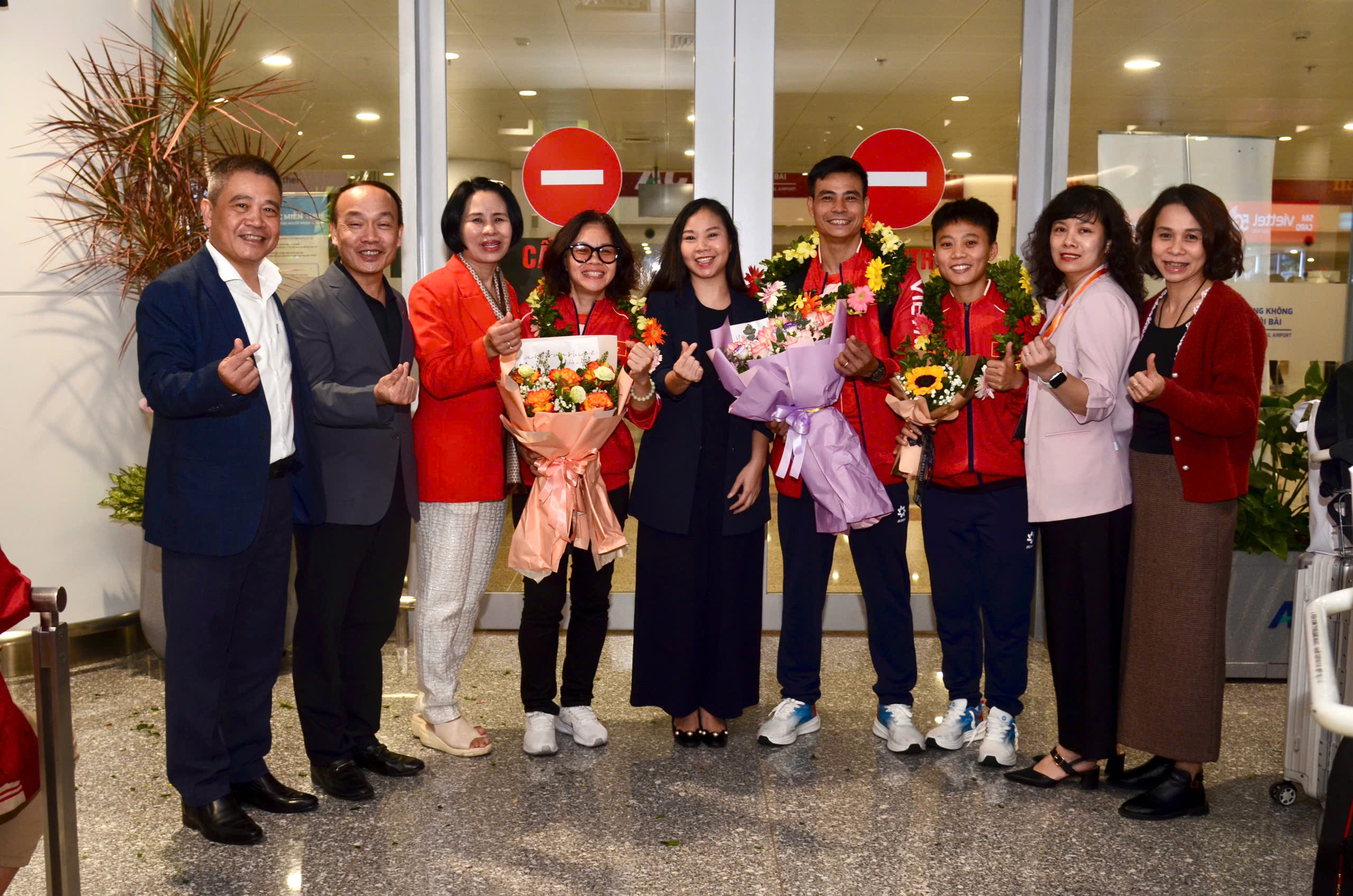Có mặt tại sân bay để đón hai đội tuyển, lãnh đạo ngành thể thao, dẫn đầu là bà Lê Thị Hoàng Yến - Phó Cục trưởng Cục Thể dục Thể thao (TDTT), cùng ông Nguyễn Văn Phú - Tổng Thư ký Liên đoàn Bóng đá Việt Nam (VFF) đã trực tiếp trao vòng hoa và gửi lời chúc mừng đến hai đội tuyển.