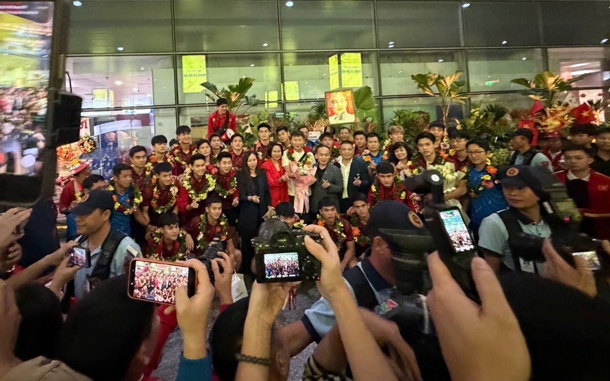 Khi cánh cửa sảnh đến mở ra, các tuyển thủ U22 Việt Nam xuất hiện trong vòng vây của người hâm mộ và giới truyền thông. Lực lượng an ninh sân bay đầy vất vả nhằm đảm bảo an toàn, thông suốt cho lối di chuyển của toàn đội cũng như các du khách khác. Trên môi của thầy trò HLV Kim Sang-sik là nụ cười rạng rỡ sau hành trình thi đấu đầy cảm xúc. Chiến thắng 3-2 trước đội chủ nhà U22 Thái Lan ở trận chung kết SEA Games 33, với màn lội ngược dòng nghẹt thở khi bị dẫn trước 2 bàn ở hiệp 1, vẫn còn nguyên dư âm trong lòng người hâm mộ.