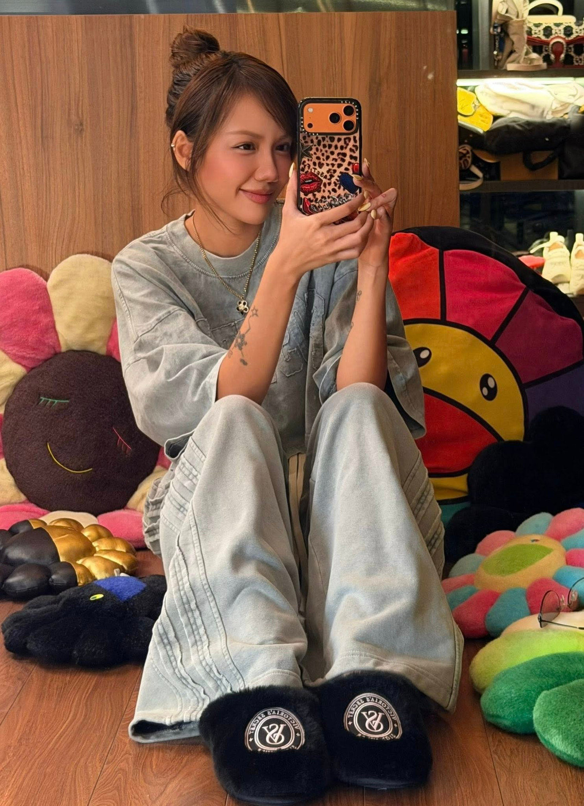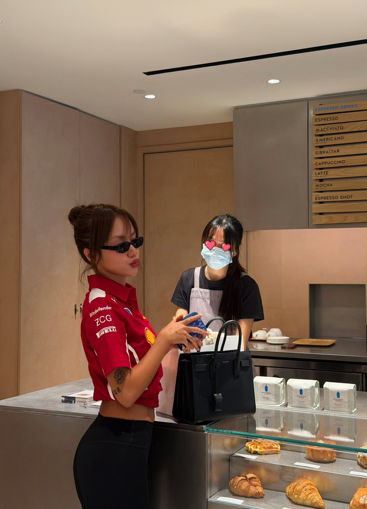 Chiếc túi xách đen tối giản và cặp kính mát nhỏ nhắn, sành điệu là những điểm nhấn hoàn thiện phong cách "slay" của nữ ca sĩ. (Ảnh: IGNV)