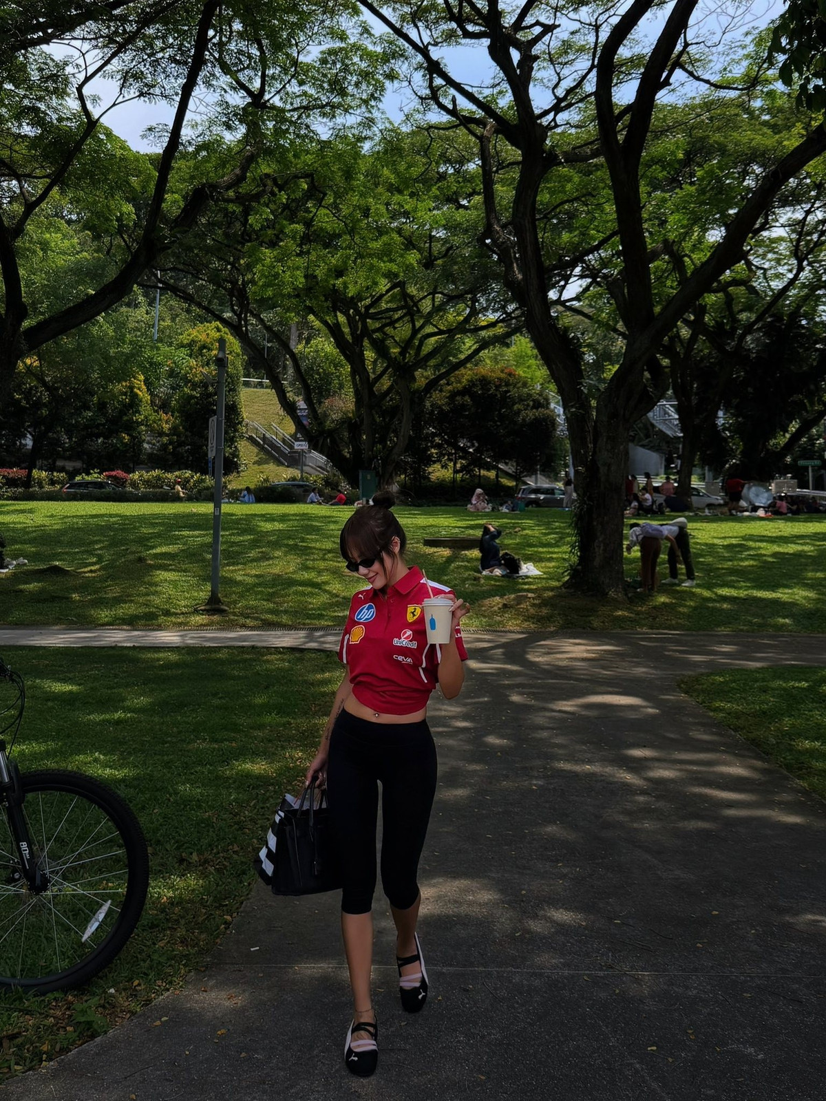 Cô nàng diện outfit vừa năng động nhưng cũng cực gợi cảm: chiếc áo polo croptop đỏ rực mang logo của đội đua Ferrari kết hợp cùng quần legging đen ôm sát. (Ảnh: IGNV)