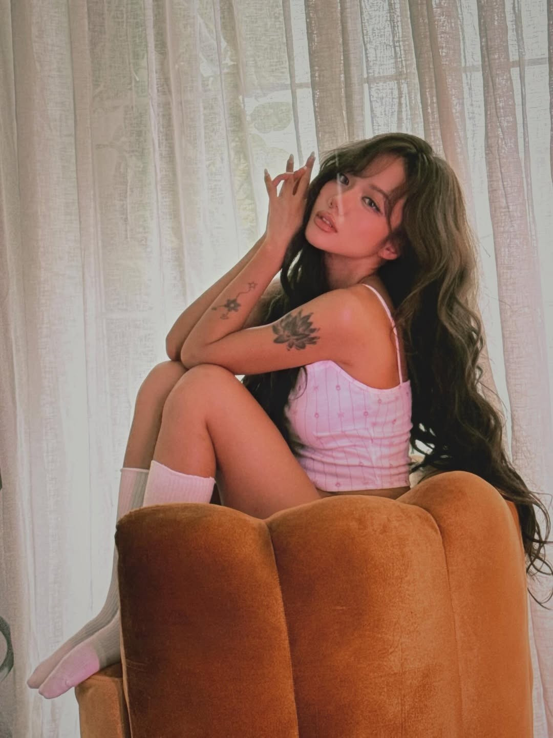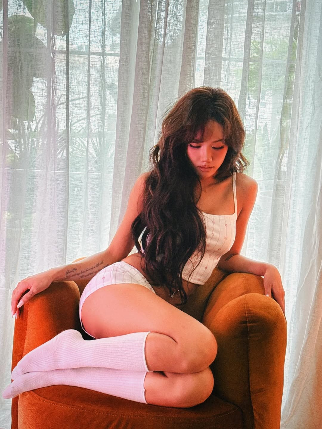 Trong bộ ảnh, nữ ca sĩ diện set đồ ngủ ngắn, mỏng manh với họa tiết kẻ sọc và hoa nhỏ màu trắng hồng ngọt ngào, khoe trọn đường cong cơ thể săn chắc, đặc biệt là vòng eo "con kiến" và hình xăm nghệ thuật trên cánh tay. (Ảnh: FBNV)