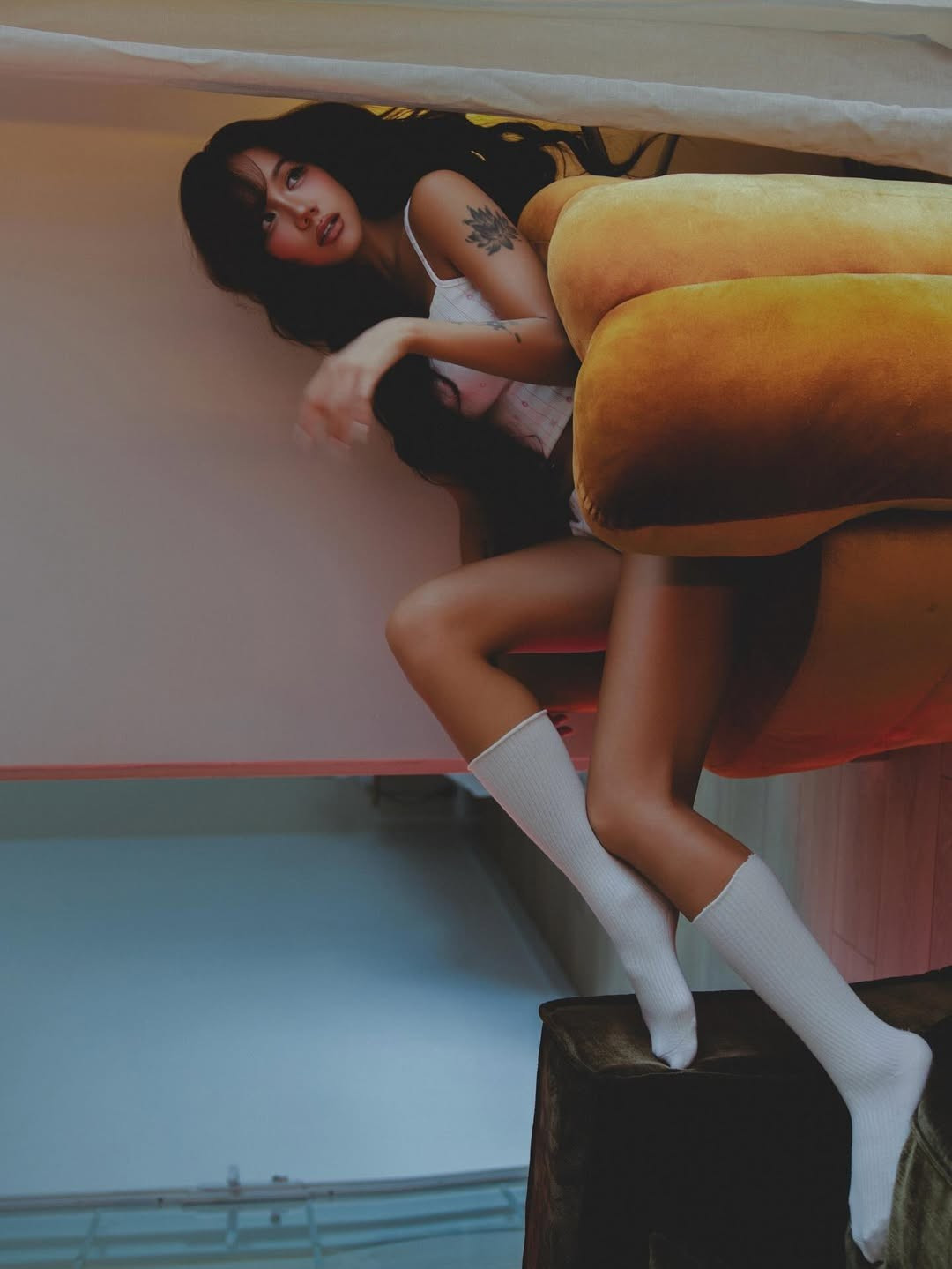 Giọng ca "Anh là ai" tạo dáng đa dạng trên chiếc ghế sofa màu vàng cam, từ ngả lưng đầy thư thái đến những khoảnh khắc trầm tư, bí ẩn, thậm chí là tinh nghịch ẩn mình sau chiếc ghế. (Ảnh: FBNV)
