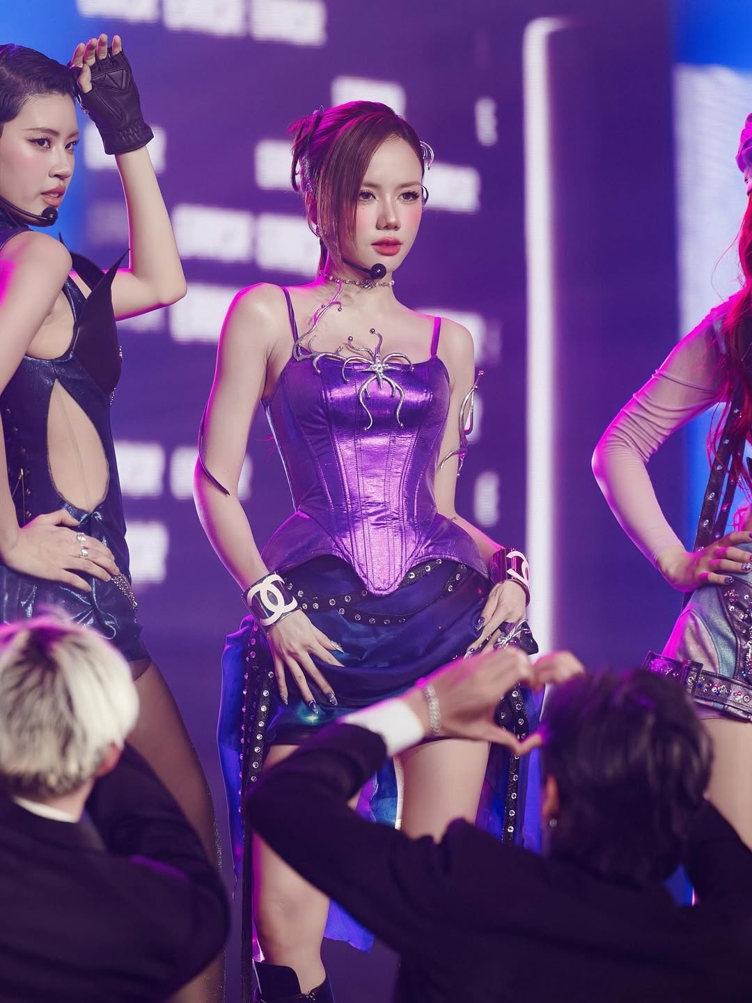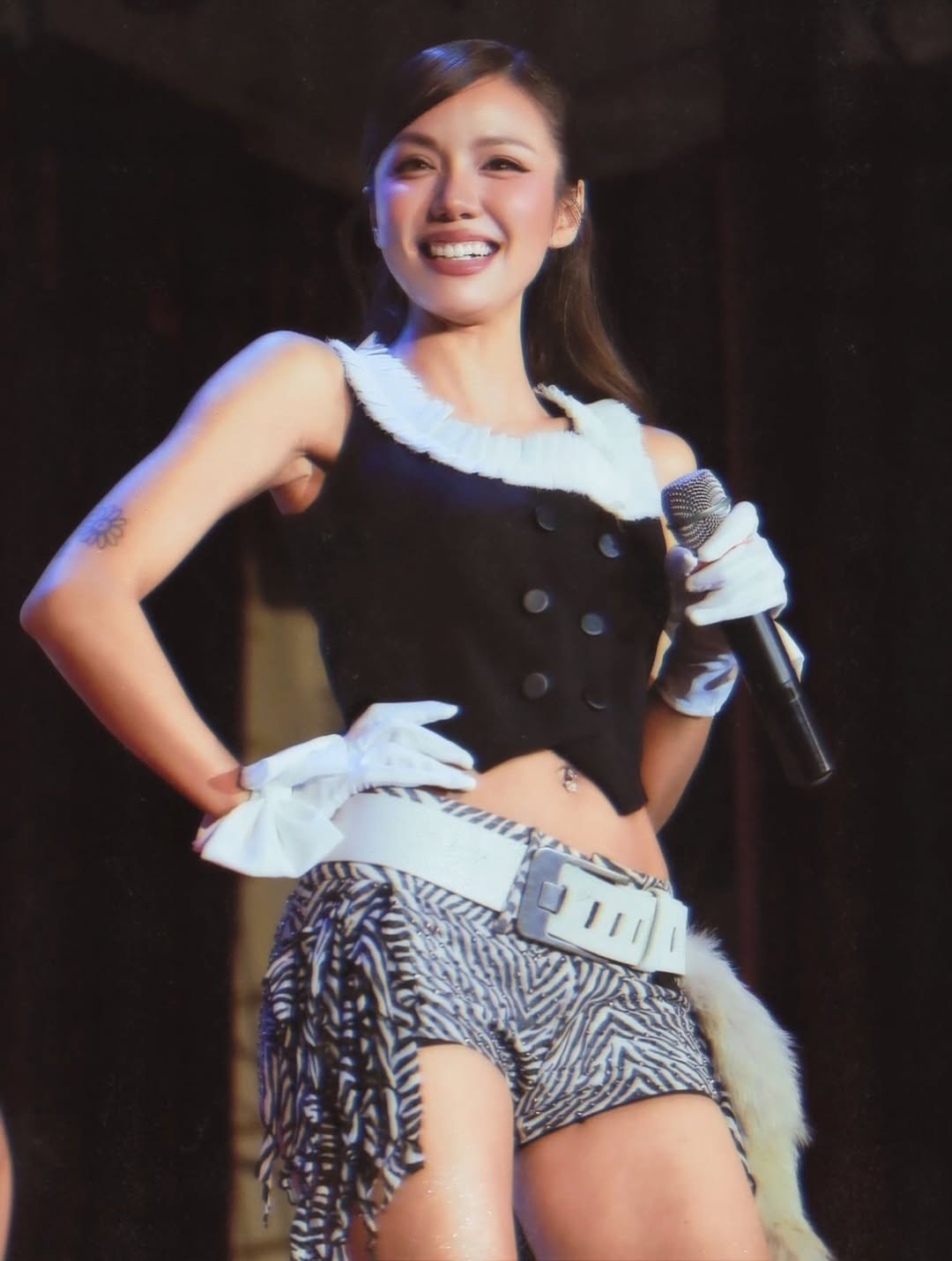 Đáng chú ý, nữ ca sĩ ngày càng cho thấy sự yêu thích với chi tiết da động vật. Đây vừa là họa tiết thịnh hành trong mùa mốt năm nay, vừa phù hợp với làn da ngăm khỏe khoắn. Trên một sân khấu tối 9/10, Phương Ly diện short ngựa vằn, bổ sung thắt lưng bản lớn. Khăn lông cài bên hông giúp tổng thể thêm phần ấn tượng. Họa tiết này cũng đặc biệt trở nên nổi bật trên nền da nâu.