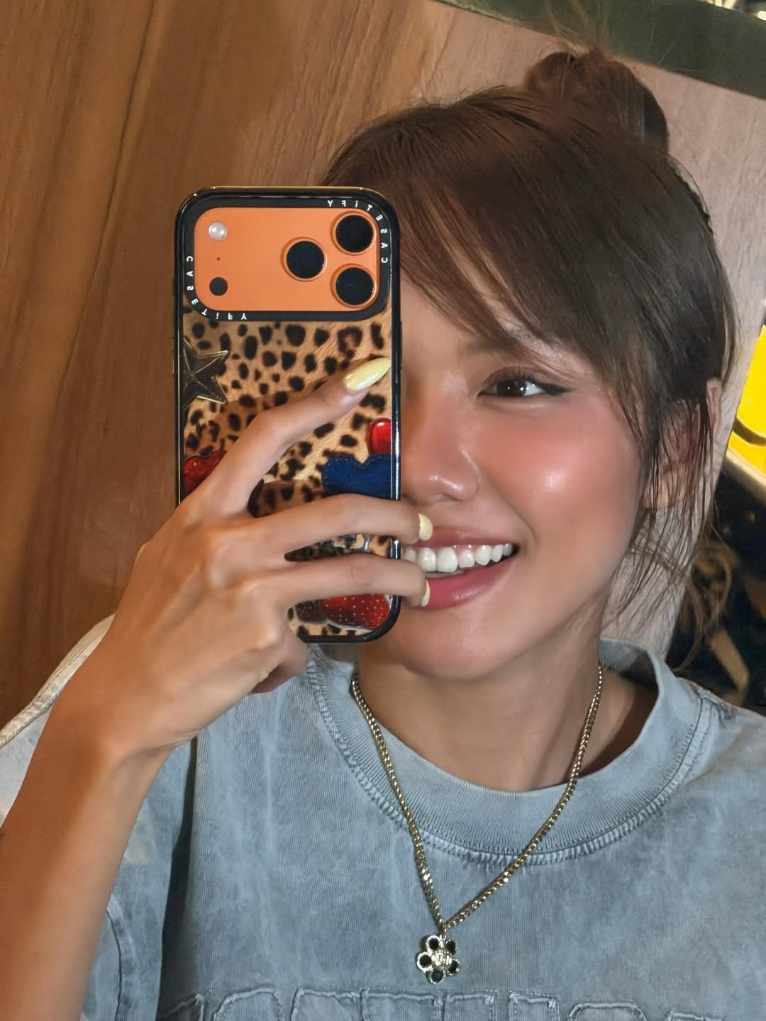 Trước đó, trong một hình ảnh chụp trước gương, Phương Ly sử dụng ốp điện thoại in họa tiết da báo, cho thấy sự yêu thích đặc biệt với chi tiết này. Với ốp lưng da báo, cô diện trang phục mang tinh thần đường phố, bao gồm áo phông xám và quần jeans đồng màu. Nữ ca sĩ bổ sung kính mắt tông nâu, đeo dây chuyền bạc dạng xích, hoàn thiện tổng thể outfit.
