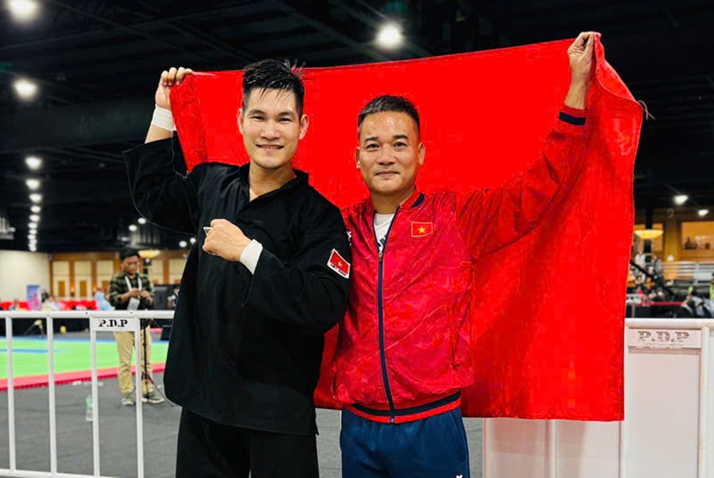Võ sĩ Nguyễn Duy Tuyến chia vui cùng huấn luyện viên sau khi giành Huy chương Vàng.