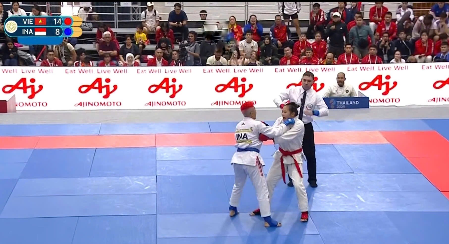 VĐV Phụng Mùi Nhình (đai đỏ) thắng VĐV Indonesia ở trận bán kết.