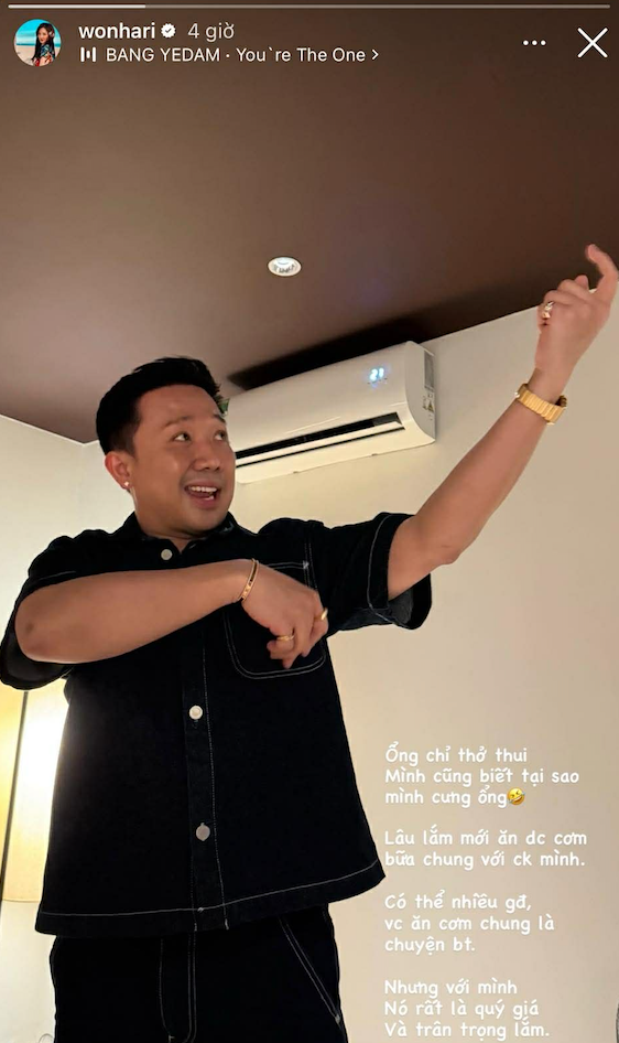 Cụ thể, nữ ca sĩ chia sẻ: "Ông chỉ thở thôi, mình cũng biết tại sao mình cưng ông. Lâu lắm mới ăn được cơm bữa chung với chồng mình. Có thể nhiều gia đình, vợ chồng ăn cơm chung là chuyện bình thường. Nhưng với mình, nó rất là quý giá và trân trọng lắm". Dòng chia sẻ ngắn gọn nhưng thể hiện rõ cảm xúc trân quý của Hari Won dành cho những khoảnh khắc giản dị trong đời sống vợ chồng.
