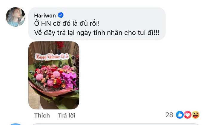 Bình luận của Hari Won nhanh chóng nhận về vô số lượt tương tác. Phần đông khán giả cho rằng đây là màn “đòi quyền lợi” đầy hài hước của nữ ca sĩ, thể hiện sự thoải mái và tinh thần trêu đùa quen thuộc giữa hai vợ chồng. Nhiều người còn nhận xét, chính cách phản ứng dí dỏm này đã phần nào xóa tan những đồn đoán không đáng có xoay quanh màn hội ngộ giữa Trấn Thành và Mai Hồ trong ngày lễ tình nhân trước đó.