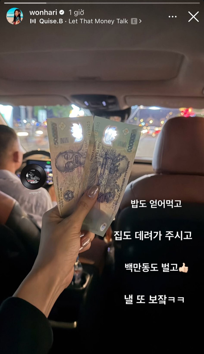 Sau một thời gian ở Hàn Quốc du lịch, Hari Won vừa chính thức quay trở lại Việt Nam và ngay lập tức gây chú ý với động thái đầu tiên trên mạng xã hội. Trên story cá nhân, nữ ca sĩ đăng ảnh đang ngồi trong xe, tay cầm hai tờ 500.000 đồng kèm dòng trạng thái bằng tiếng Hàn chỉ vỏn vẹn 21 từ – đơn giản nhưng đủ khiến khán giả phải bật cười.