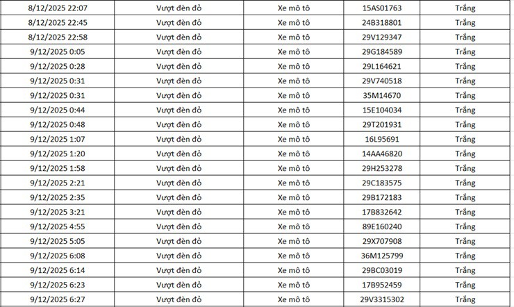 Theo ghi nhận từ danh sách phạt nguội tại Hà Nội, số lượng xe máy bị xử phạt lỗi vượt đèn đỏ trong khung giờ từ 22h đến 6h sáng chiếm tỷ lệ không nhỏ. Đây chính là khoảng thời gian nhiều người chủ quan, cho rằng việc vi phạm sẽ khó bị phát hiện.