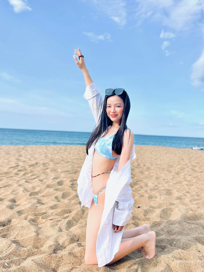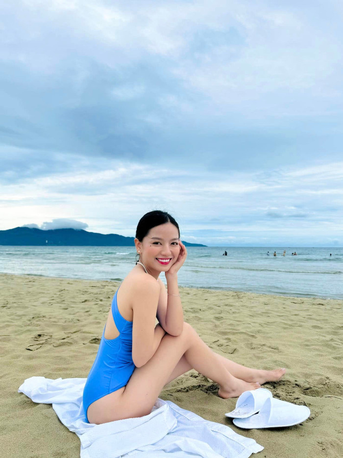 Dù là trong bộ bodysuit xanh dương thanh lịch hay bikini xanh mây dịu mắt, Hạ Anh vẫn toát lên vẻ trẻ trung, tràn đầy sức sống. Ảnh: FBNV