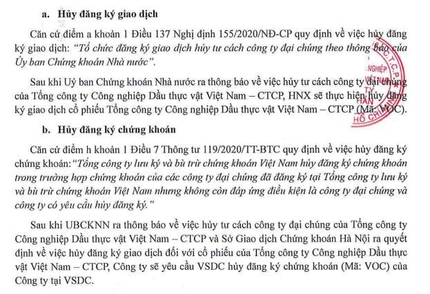 Theo Nghị quyết Đại hội đồng cổ đông bất thường năm 2025, Tổng Công ty Công nghiệp Dầu Thực vật Việt Nam (Vocarimex, mã ck: VOC) đã được gần như toàn bộ cổ đông thông qua việc hủy tư cách công ty đại chúng, hủy đăng ký giao dịch cổ phiếu trên UPCoM và phương án đảm bảo quyền lợi cho cổ đông.