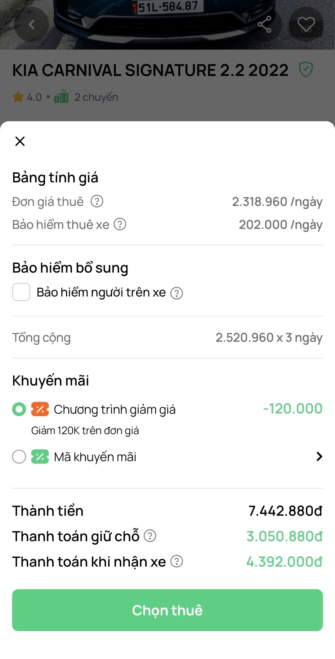 Trên thông tin đặt xe, đơn giá thuê ôtô tự lái dịp Lễ, Tết chỉ áp dụng cho duy nhất ngày 1/1. Khi thuê xe vào ngày thứ sáu (2/1/2026), đơn giá thuê xe được áp dụng như ngày thường.