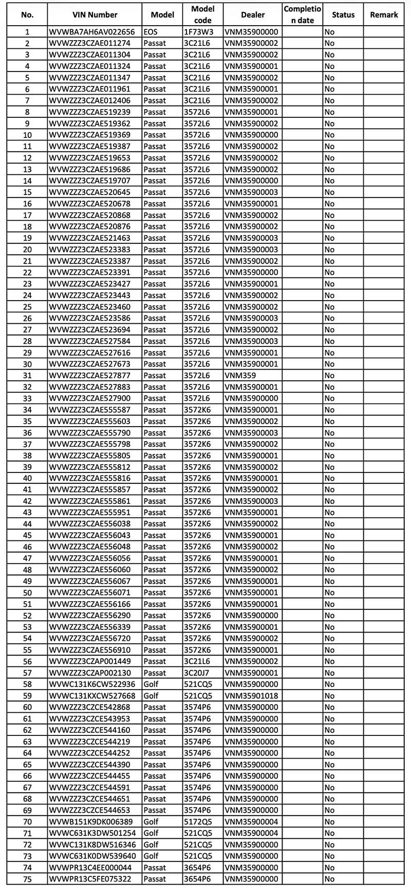 Cục Đăng kiểm Việt Nam cho biết Volkswagen Việt Nam đang triệu hồi 75 xe Passat và Golf do nguy cơ lỗi bộ bơm khí túi khí Takata. Chương trình kiểm tra và thay thế linh kiện kéo dài từ tháng 2/2026 đến tháng 2/2029.