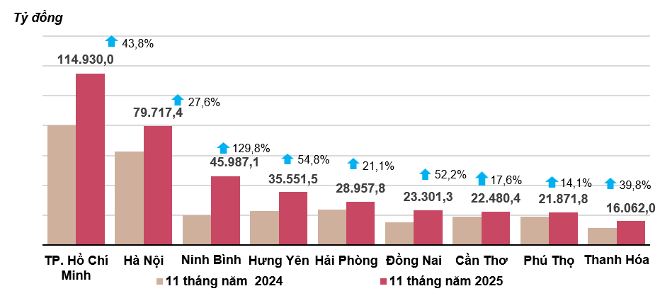 Vốn đầu tư thực hiện từ nguồn ngân sách nhà nước 11 tháng năm 2024-2025 của một số địa phương. Nguồn Cục Thống kê
