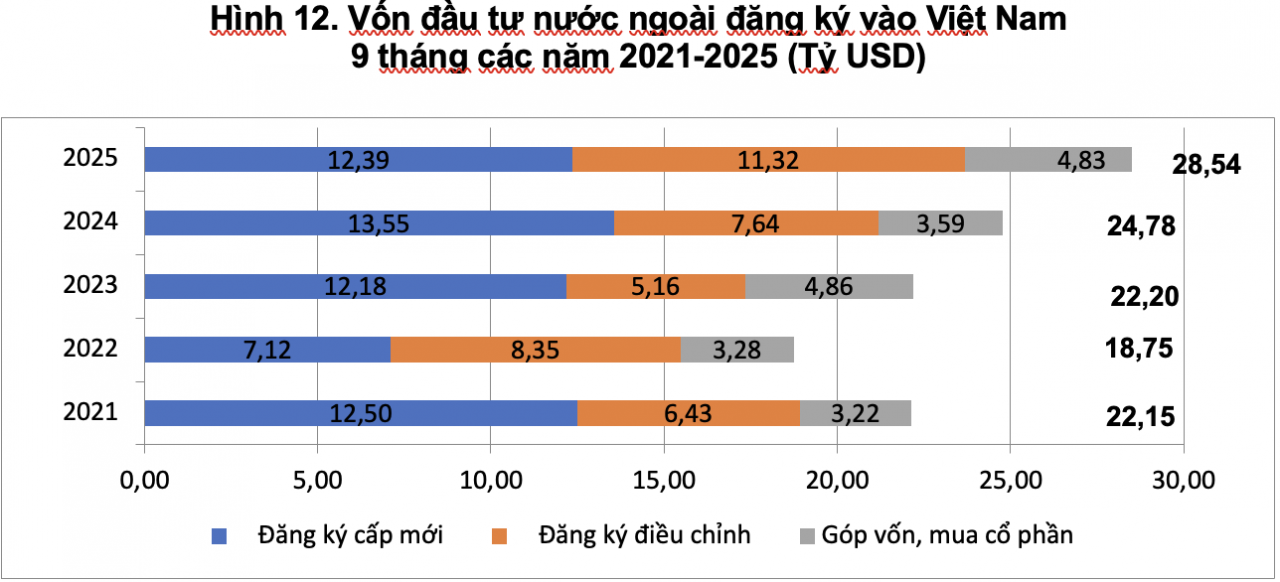Về vốn đầu tư nước ngoài, tính đến ngày 30/9/2025, tổng vốn đầu tư nước ngoài đăng ký vào Việt Nam (gồm cấp mới, điều chỉnh, góp vốn, mua cổ phần) đạt 28,54 tỷ USD, tăng 15,2% so với cùng kỳ năm trước