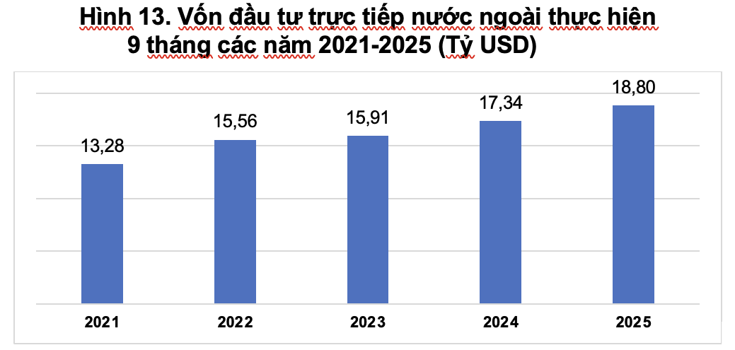 Đặc biệt, vốn FDI thực hiện tại Việt Nam trong 9 tháng đạt 18,80 tỷ USD, tăng 8,5% so với cùng kỳ năm trước – mức cao nhất giai đoạn 2021–2025. Trong đó, công nghiệp chế biến, chế tạo đạt 15,56 tỷ USD, chiếm 82,8% tổng vốn đầu tư trực tiếp nước ngoài thực hiện; hoạt động kinh doanh bất động sản đạt 1,37 tỷ USD, chiếm 7,3%; sản xuất, phân phối điện, khí đốt, nước nóng, hơi nước và điều hòa không khí đạt 598,7 triệu USD, chiếm 3,2%.