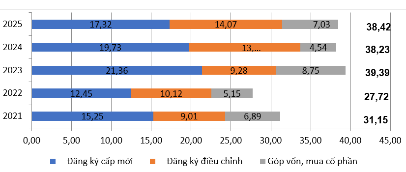 Vốn đầu tư nước ngoài đăng ký vào Việt Nam trong các năm 2021-2025 (đơn vị tính tỷ USD). Đồ họa: CTK