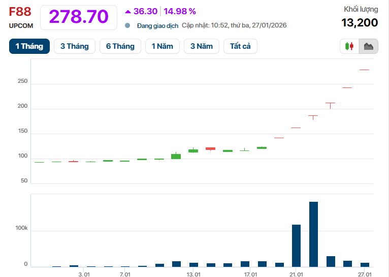 Phiên sáng 27/1, cổ phiếu F88 lại gây chú ý khi tăng trần phiên thứ 6 liên tiếp, lên mức 278.700 đồng/cp, nâng mức tăng của chuỗi "tím" lên gần 97%.