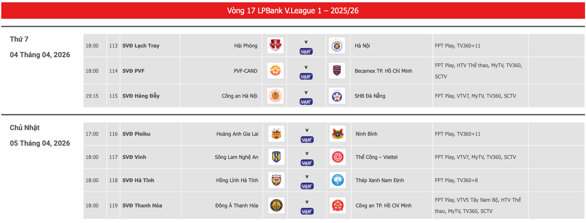 Ở một cặp đấu khác, Hà Nội FC có chuyến làm khách trên sân Lạch Tray của Hải Phòng. Đây không chỉ là trận đấu mang tính điểm số, mà còn là cuộc so tài về bản lĩnh và tâm lý.