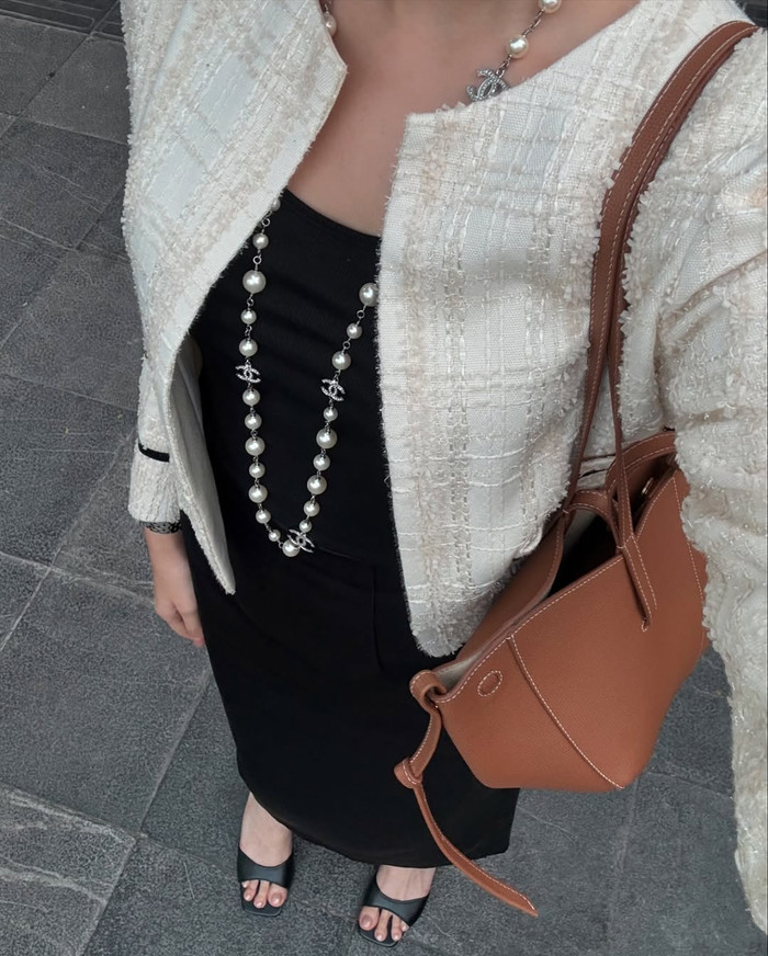 Khi phối cùng áo tweed màu kem, Đỗ Thị Hà khéo léo tạo nên một diện mạo hiện đại nhưng vẫn giữ nét cổ điển đặc trưng. Chất liệu tweed mang tính biểu tượng của thời trang Pháp giúp tổng thể trở nên mềm mại và thanh lịch. Trong khi đó, chiếc đầm đen khoe được sự tối giản, tạo khoảng nền hoàn hảo để chuỗi vòng Sautoir tỏa sáng.