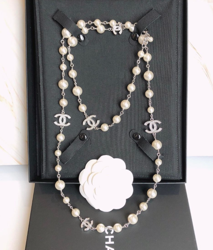 Vòng cổ được Đỗ Thị Hà lựa chọn để tạo điểm nhấn cho bộ outfit chính là Chanel Pearl and Silver Crystal Logo. Điều làm nên sự đắt giá của chiếc vòng nằm ở chính cấu trúc Sautoir, kiểu dây chuyền ngọc trai dáng dài trứ danh của Chanel. Với chiều dài lý tưởng từ 100 cm trở lên, người đeo có thể linh hoạt biến tấu: quấn thành hai vòng để tạo hiệu ứng layer tinh tế, hoặc thả dài để tạo điểm nhấn mềm mại, sang trọng như cách Đỗ Thị Hà đang thể hiện.