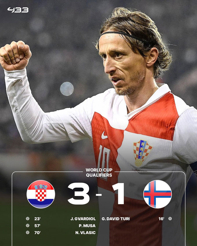 Á quân World Cup 2018 Croatia ngược dòng đánh bại Đảo Faroe để khép lại hành trình vòng loại bằng tấm vé chính thức tới World Cup 2026.