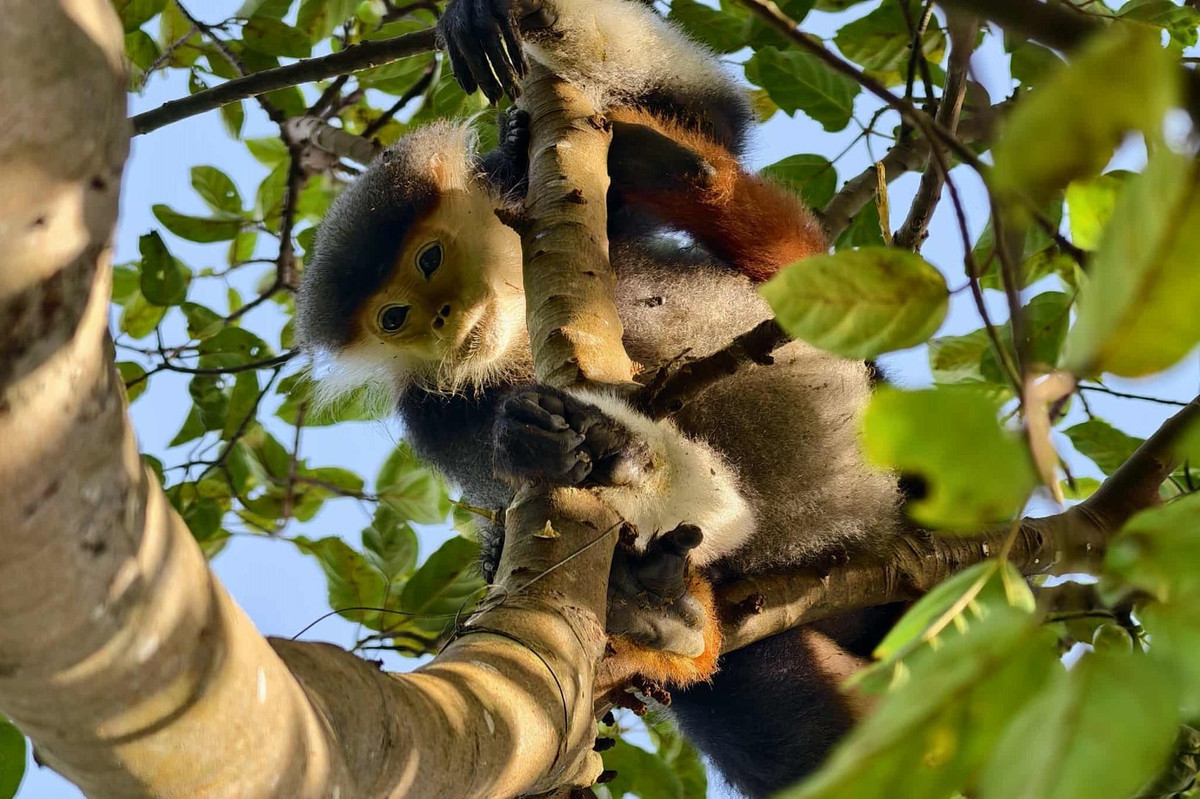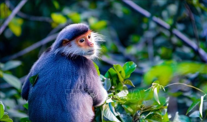 Được mệnh danh là “Nữ hoàng linh trưởng” bởi vẻ đẹp rực rỡ và hiếm có, loài voọc chà vá chân nâu nằm trong Sách đỏ Việt Nam. Ảnh: TTXVN.