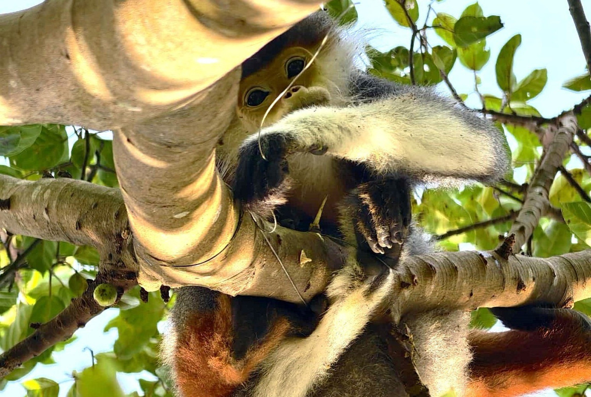 Theo đó, nhiều du khách trong nước và quốc tế ghé thăm nơi này để tham quan, chụp ảnh và tìm hiểu về loài voọc chà vá chân nâu quý hiếm. Ảnh: TTXVN.