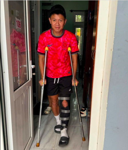 Hình ảnh Vũ Tiến Long chống nạng di chuyển trước khi được phẫu thuật