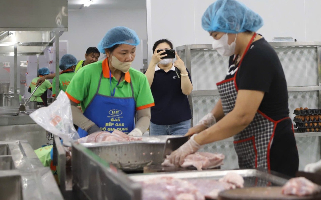 Ngoài việc cung ứng thực phẩm tươi sống, đơn vị còn tổ chức nấu suất ăn sẵn cho những trường không có bếp ăn bán trú, hoặc không đủ điều kiện cơ sở vật chất để tự chế biến. Ảnh: Hà Phương