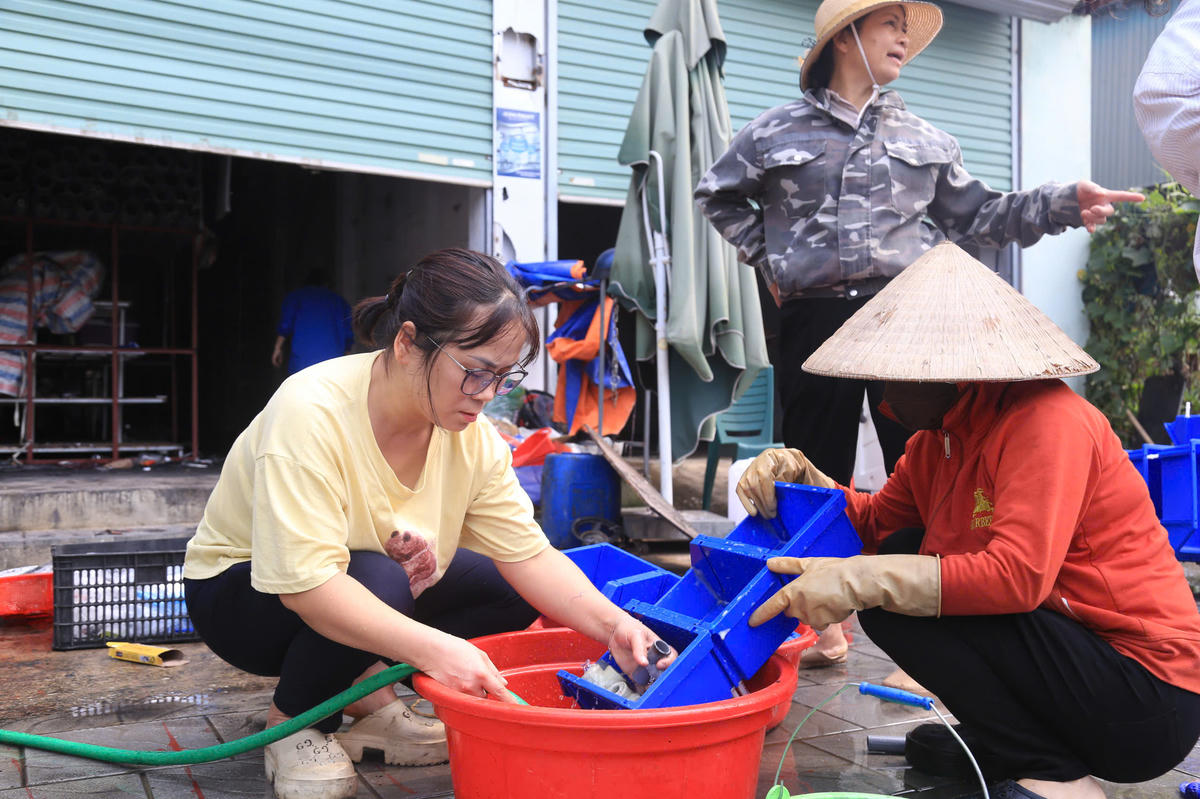 Chị Thủy (áo vàng) cùng người dân đang phân loại một số vật dụng còn sót lại. Ảnh: Ngô Hùng.