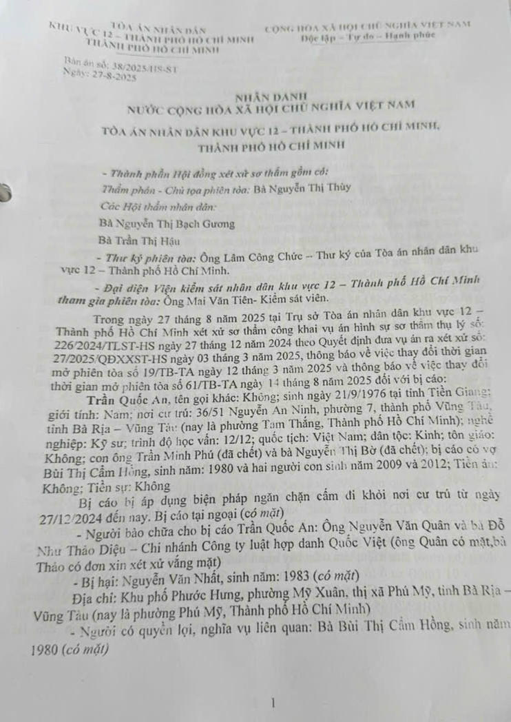 Tại phiên sơ thẩm ngày 27/8/2025, cấp sơ thẩm cho rằng bị cáo An có lỗi chính vì không nhường đường cho xe đi từ bên phải tới theo Điều 24 Luật Giao thông đường bộ. Tòa cho rằng xe ông Nhất “đang ở hướng ưu tiên trong tình huống giao nhau không có đèn tín hiệu hoặc biển nhường đường”, nên tuyên bị cáo An 1 năm tù giam.
