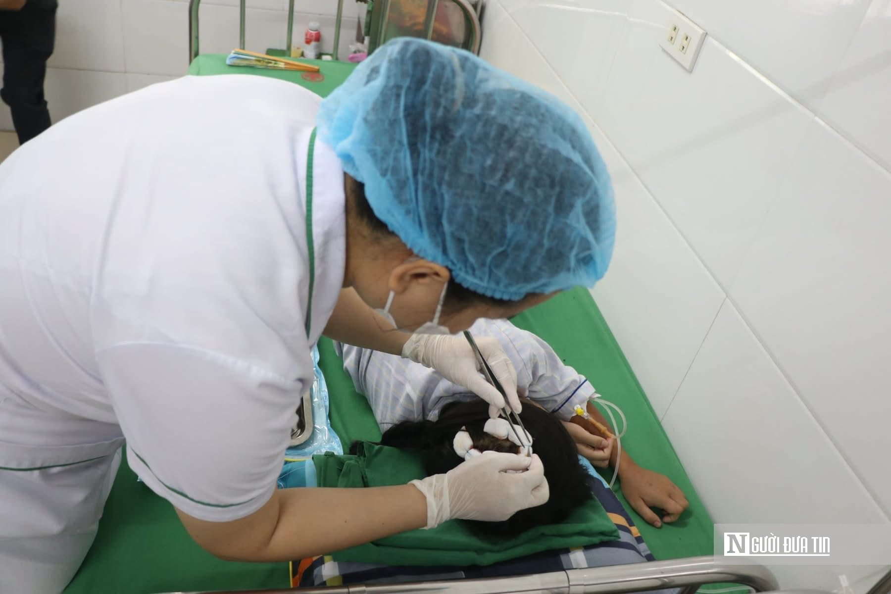 Các bác sĩ xử lý vết thương trên đầu cho bệnh nhi.