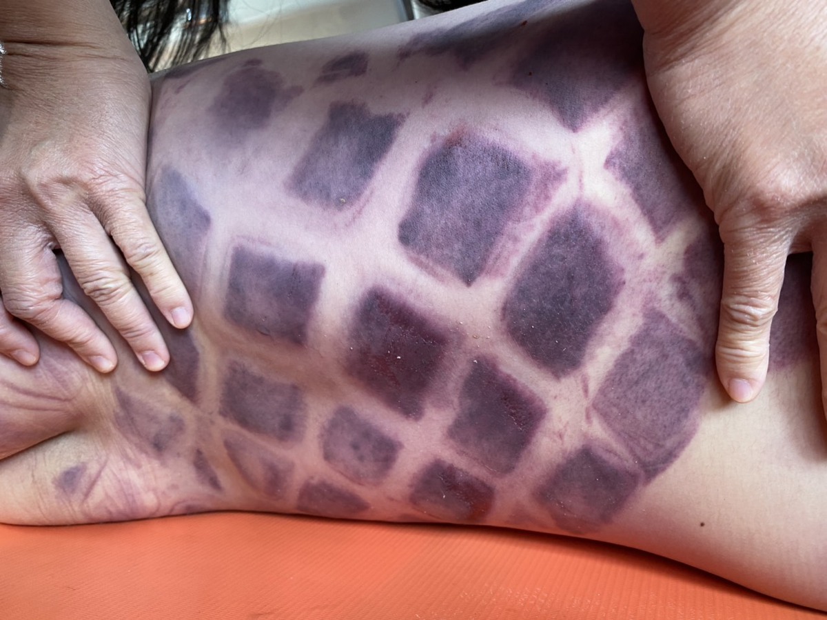 Phần lưng tím bầm của bé trai sau khi bị hút vào tấm lưới dưới hồ bơi nằm trong Khu nghỉ dưỡng Centara Mirage Resort Mũi Né. Ảnh: Liên Trần