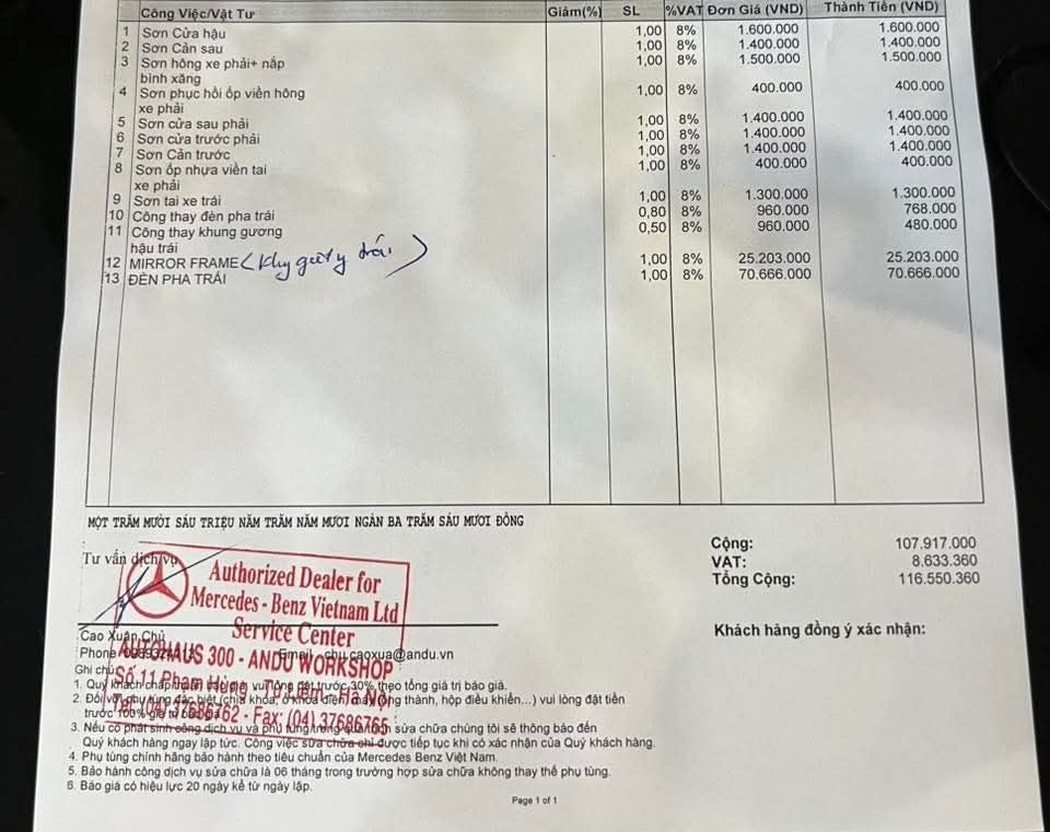 Để đánh giá thiệt hại, ngày hôm sau, chị Ngọc đã mang xe đến trung tâm dịch vụ của Mercedes-Benz và được thông báo tổng chi phí sửa chữa, khắc phục là 116,55 triệu đồng.