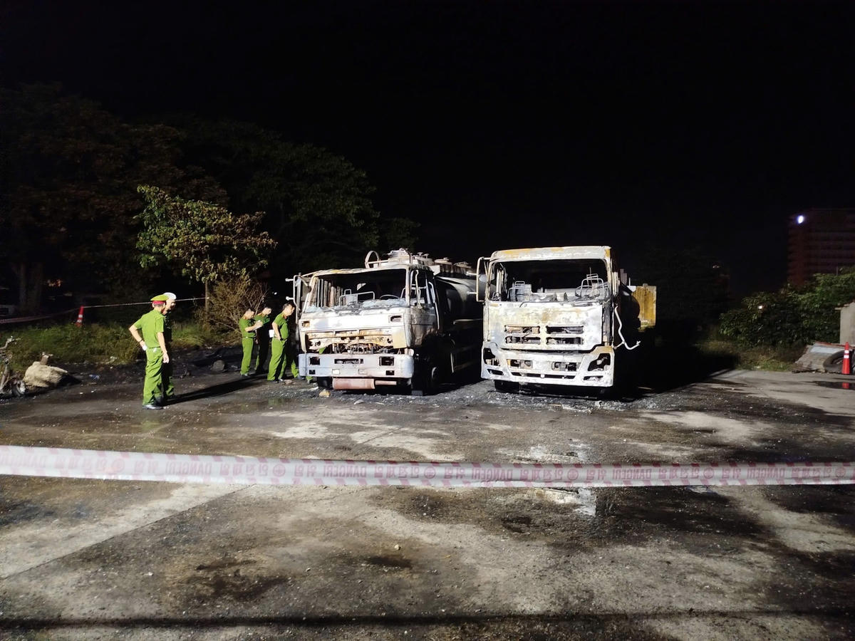 Công an TP Đà Nẵng điều tra vụ hút xăng dẫn đến cháy lan 2 xe bồn. Ảnh: Nguyễn Tú.