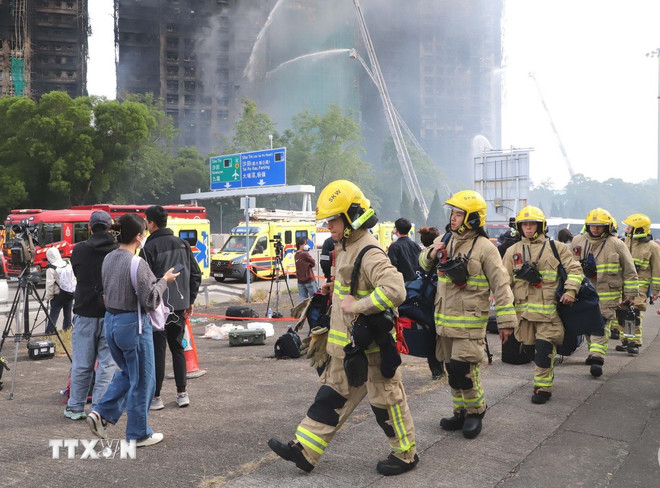 Lính cứu hỏa nỗ lực dập lửa tại hiện trường cháy tòa chung cư ở quận Tai Po, Hong Kong (Trung Quốc) ngày 26/11/2025. (Ảnh: THX/TTXVN)