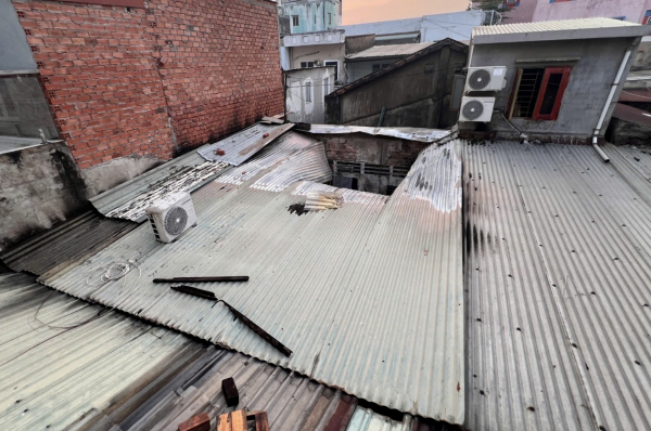 Phía bên trên, mái tôn căn nhà được phá dỡ một khoảng lớn để lửa và khói bốc ra ngoài trong lúc chữa cháy. Công an phong tỏa nghiêm ngặt một đoạn hẻm trước hiện trường để phục vụ công tác điều tra.