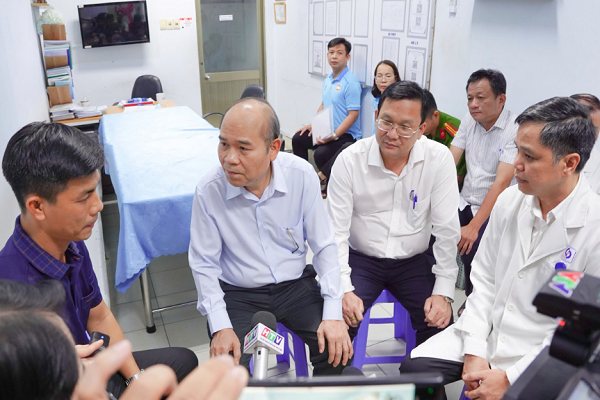 Trưa 5.12, Phó Chủ tịch UBND TPHCM Trần Văn Bảy (thứ 3 từ phải sang) đã đến khoa Cấp cứu, Bệnh viện Nhân dân Gia Định để thăm hỏi và động viên gia đình của hai nạn nhân.