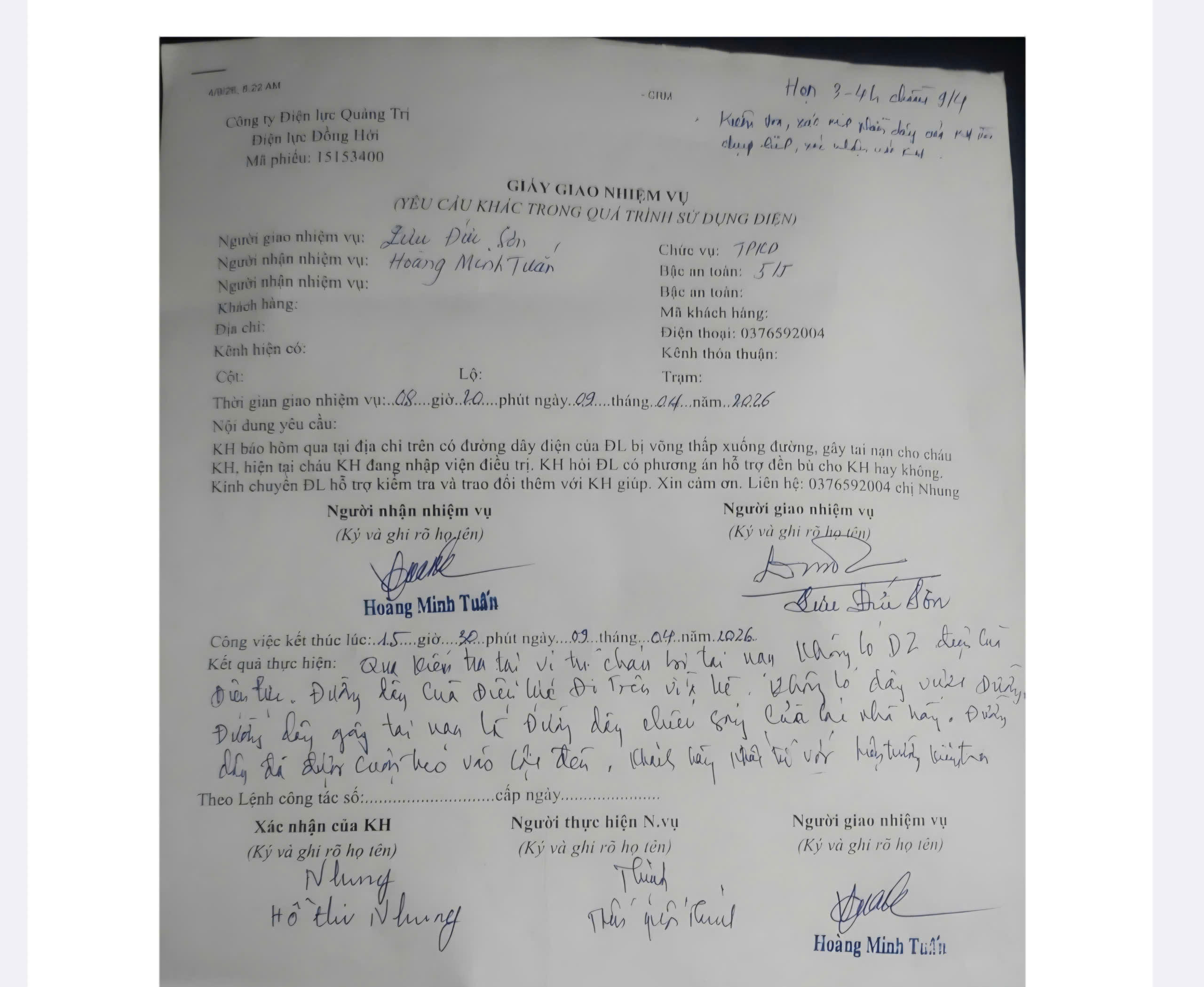 Ngay sau khi tiếp nhận, Điện lực Đồng Hới đã cử lực lượng trực vận hành đến hiện trường để kiểm tra, xác minh.